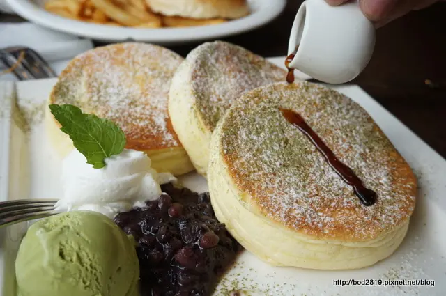 鬆餅我們選擇黑糖蜜,因為是抹茶鬆餅嘛,