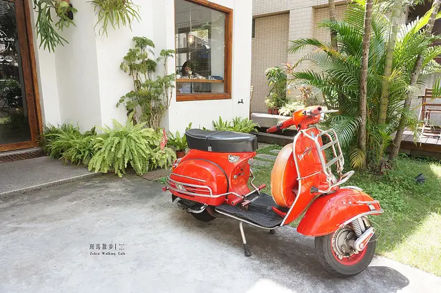 門口擺著亮紅色的偉士牌機車