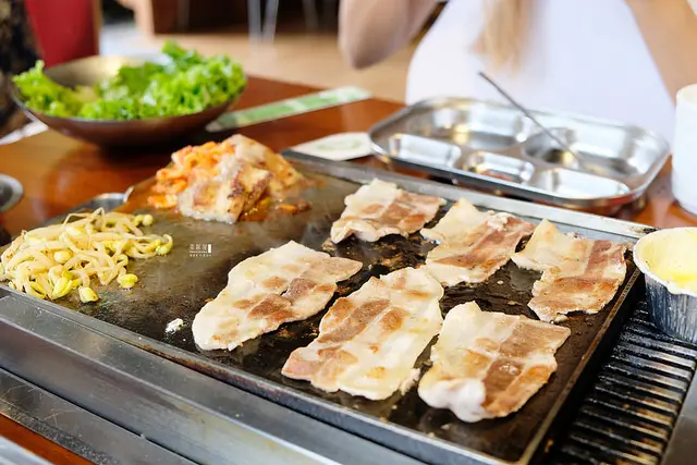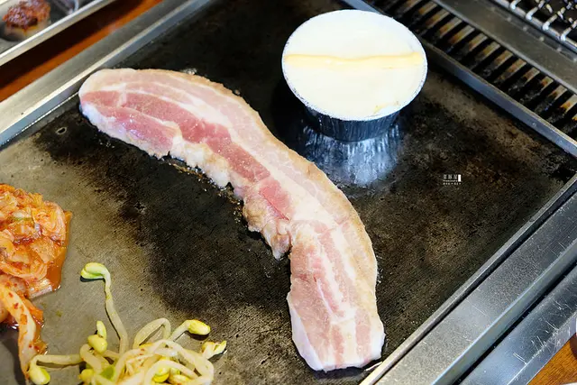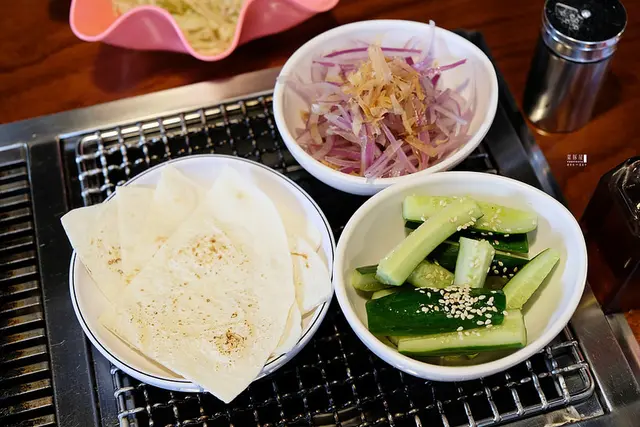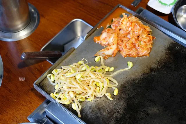 烤盤旁邊有辣豆芽及泡菜,可搭配生菜及烤肉一起食用