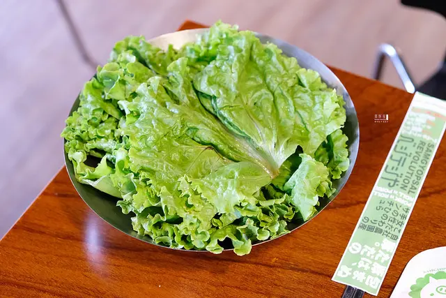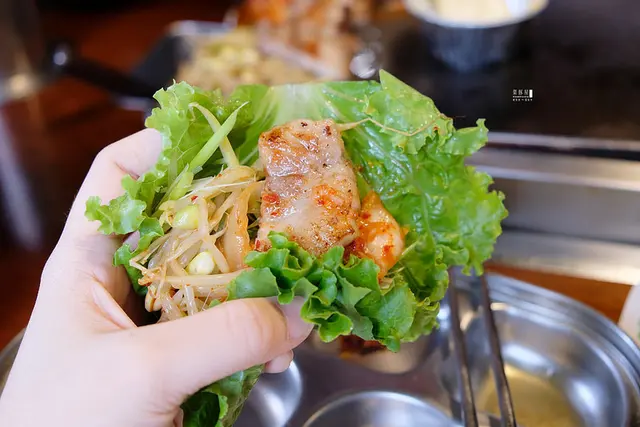 拿一片有機生菜,沾點紅味噌醬、放上些許辣豆芽及泡菜、鋪上蔥沙拉