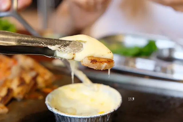 店員先將五花肉沾取大量融化起司,濃郁模樣好邪惡呀