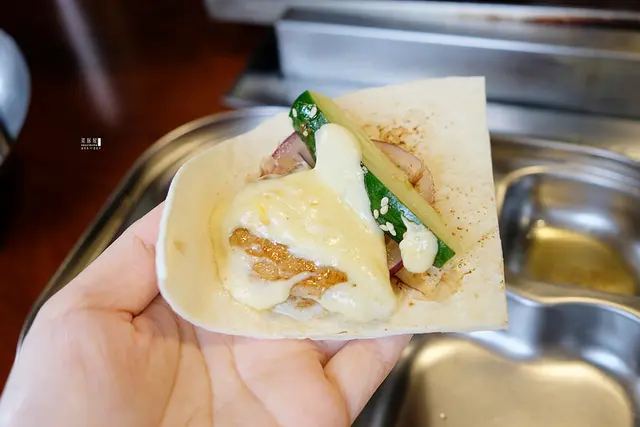 墨西哥餅皮上頭放上洋蔥及小黃瓜,搭配起司五花肉一起入口