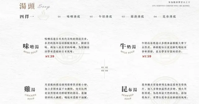 湯底有四種可以選擇:味噌湯(+39元)、牛奶湯(+59元)、雞湯、昆布湯