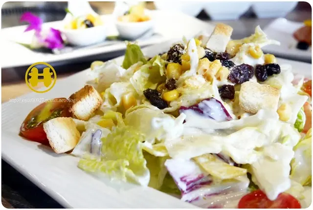 大量的鮮蔬有和番茄、玉米、果乾真是豐富的一盤沙拉,