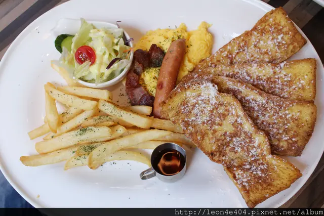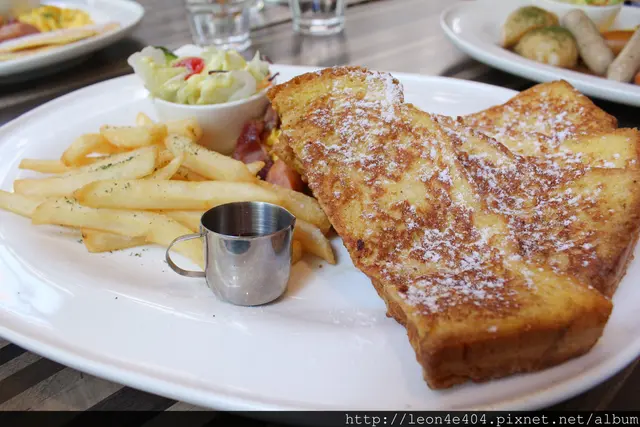 整體組合也是薯條+培根炒蛋香腸+沙拉,不過主角換成了法國吐司
