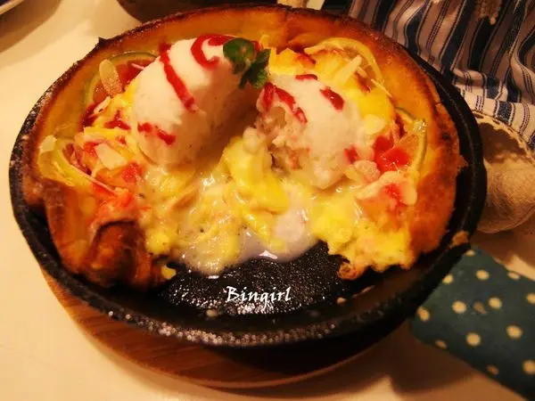 一樣是用鐵鍋鬆餅的鍋子裝著,旁邊還擺上一些生菜