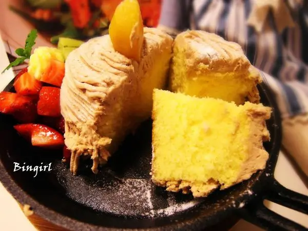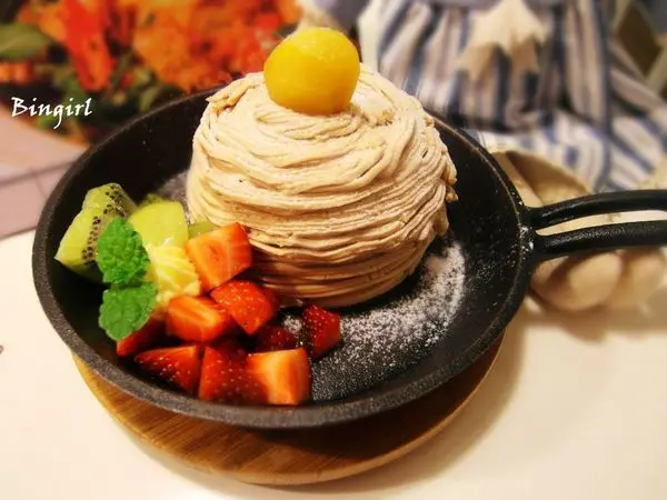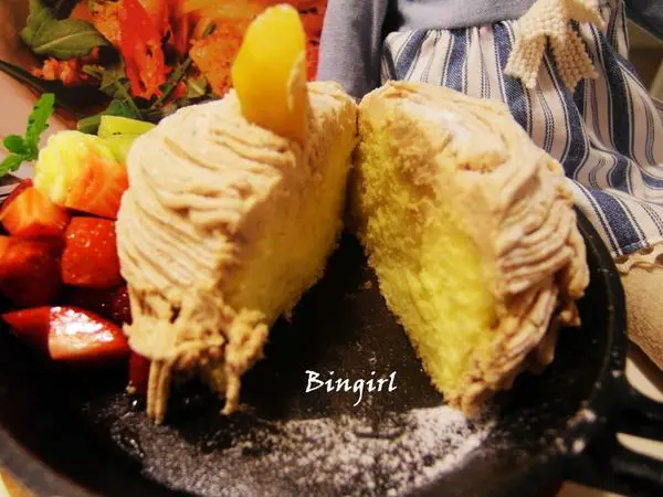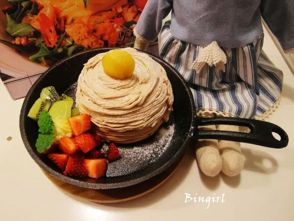 旁邊在擺上一點時令水果,整體看來很像蒙布朗蛋糕,但裏頭卻是厚實的鬆餅