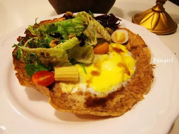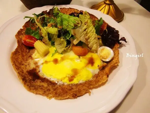 餅皮上鋪滿油醋沙拉還有一顆蛋,包著一起吃會比較適合