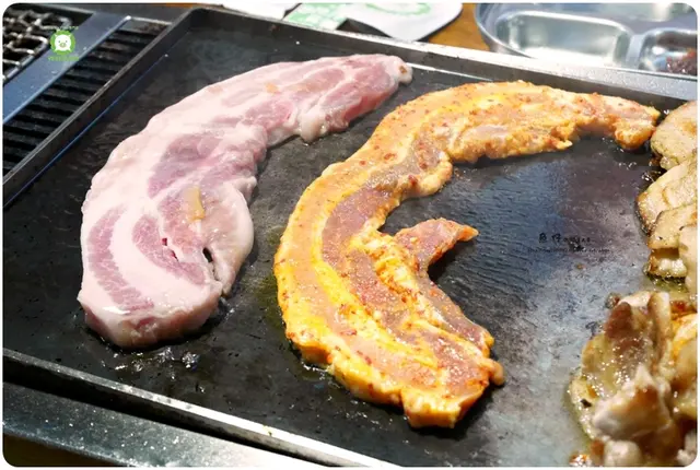 三層肉油脂豐富,在鐵板上將油脂逼出後煎烤到呈現金黃色澤...