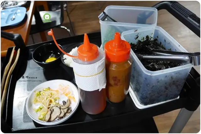 吃到都滿到喉頭,服務人員這時推出餐車,上面放了白飯、海苔絲、小菜、生蛋和調味料