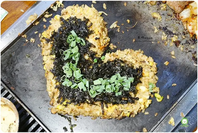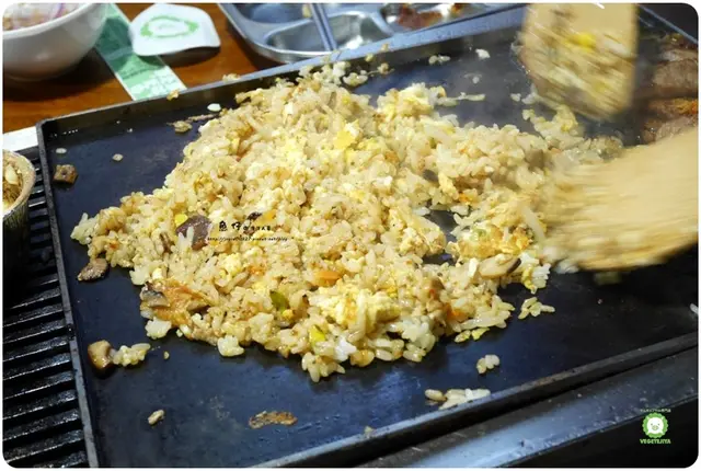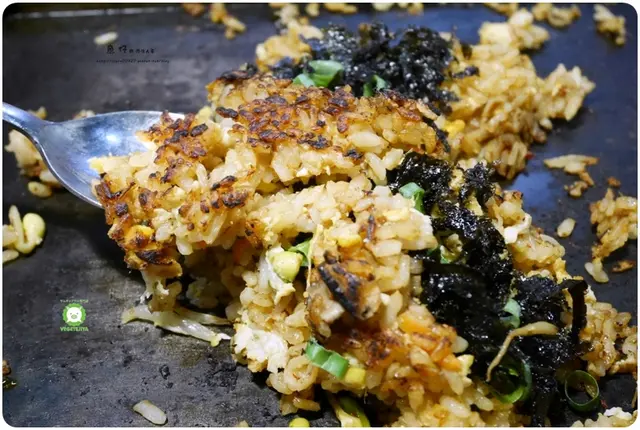 御飯持續在鐵板上面一段時間底部開始焦硬呈現鍋巴的口感
