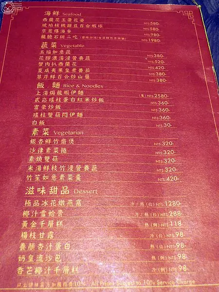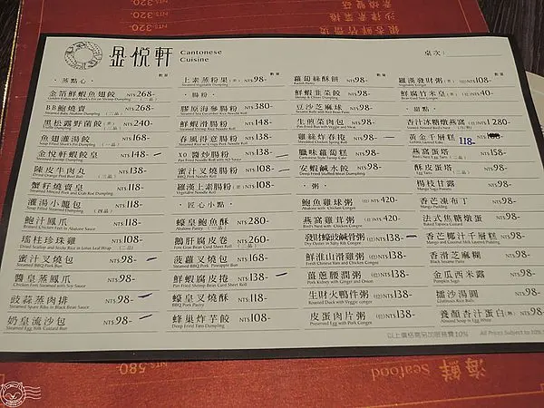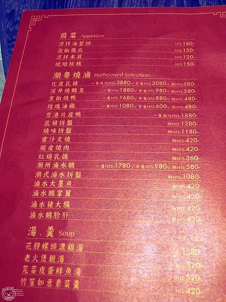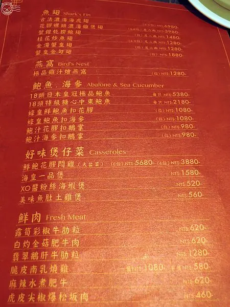 菜單是紅底金字,現場看起來很氣派,但在搭配上餐廳的黃光真的超~~難拍的!!!
