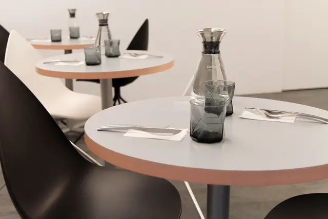 位於一樓的座位,全白搭上粉色圓桌與黑色小椅,