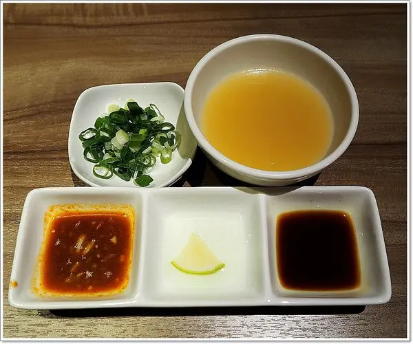 先送上來的沾醬。那碗是高湯,會直送來一壺,慢慢喝。沾醬由左到右是「味噌、檸檬、醬油」。我對那個味噌比較有興趣,所以沾完後再請小姐再補一碟來。