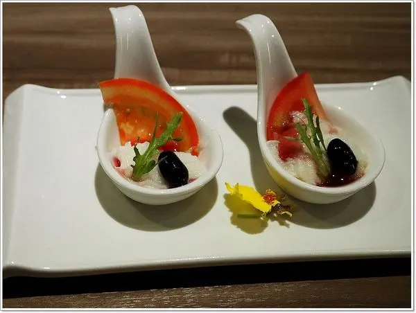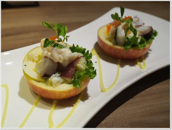 「精緻小品」! 蘋果上面是一些貝類的海鮮! 很有誠意的小品