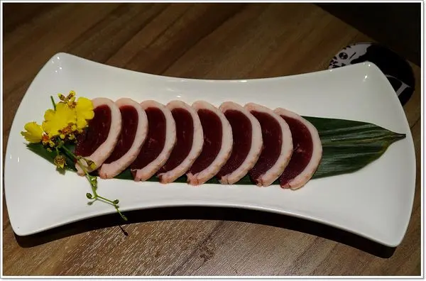 「宜蘭鮮嫰櫻桃鴨」,這是第5道肉了! 櫻桃鴨素負盛名,但從來沒看過切片是長這樣子的呀! 吃起來較沒一般鴨肉的老硬,反而有點粉粉的感覺,不知是不是有再特別處理過。