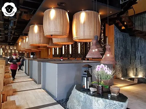 用餐空間相當寬敞並且區分成一個個獨立的半開放式小包廂,大量使用石材與木質元素,呈現一個氣派卻不失內斂的風格。