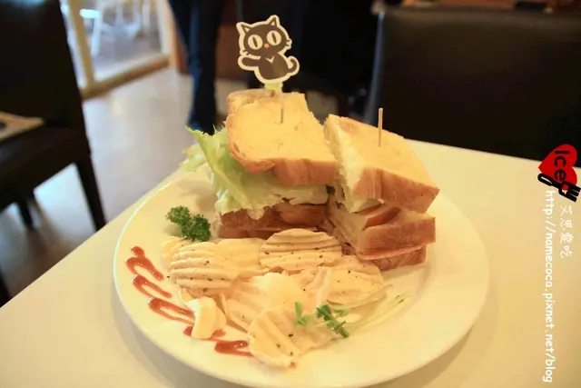 三明治切成對半附洋芋片端上桌來,還贈了一隻小黑仔! 請問是想吃三明治裡面包的鮪魚嗎!!!???