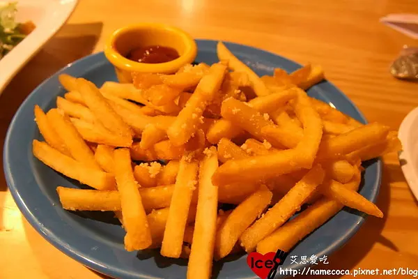 薯條灑了起司,大小偏粗厚,外皮微硬脆帶有微微鹹度,普上。