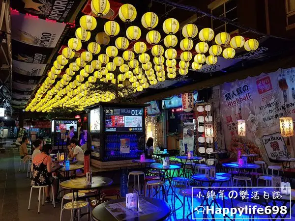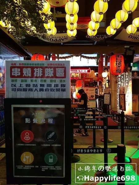 露天式的用餐環境、矮桌與矮凳,加上大篇幅的酒水廣告,頗具台式熱炒店的風格,不過上頭那一整排黃色的燈籠倒是增添不少日本慶典的味道。