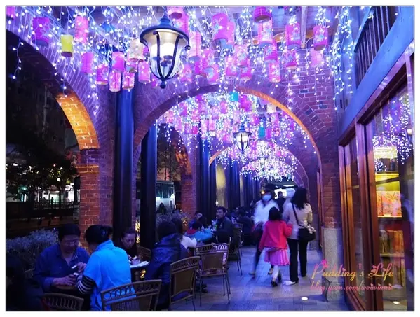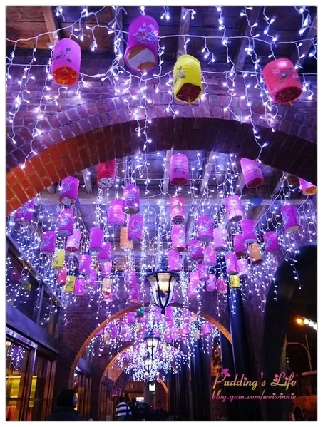 夜晚的燈飾將圓拱門裝點的好有氣氛