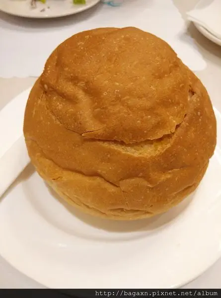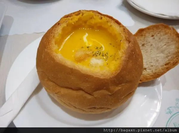 裝乘湯品的容器是店家手工自製法國球麵包,