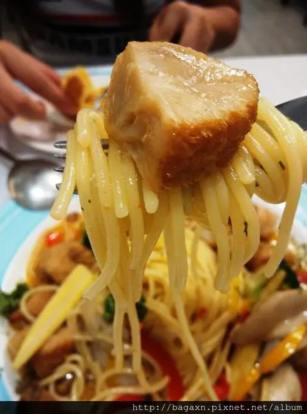搭上一旁的燻雞肉片與杏鮑菇口感層次更為美味!