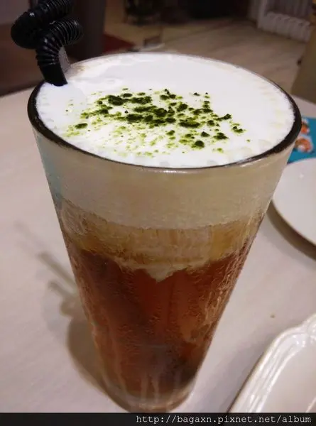 底下是以微甜的綠茶為基底,上面覆蓋上一層濃濃的奶蓋,