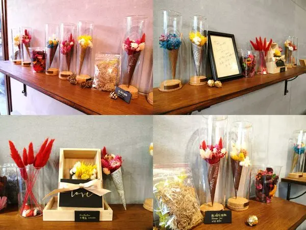 一邊是手作乾燥花,有用玻璃瓶裝的花束,還有木盒裝的,看起來都好美,好適合送人
