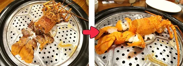 紅腳龍蝦 吃完小蝦,現在要來吃大蝦,這隻就是剛剛店家現撈上來的紅腳龍蝦,經過處理的模樣 將龍蝦切成一塊塊,不僅容易熟透,吃的時候也方便許多,不用再費力剝蝦殼囉