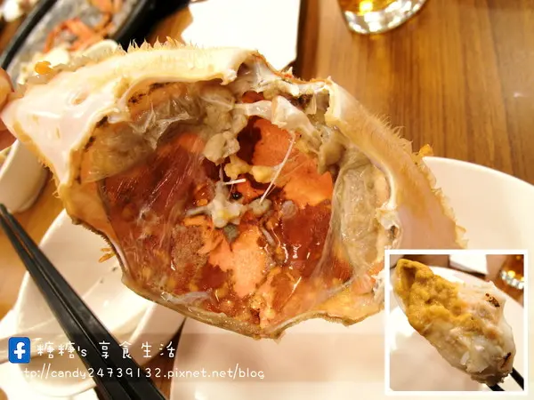 每次吃螃蟹前,第一個吃的部位就是蟹殼,雖然蟹殼沒什麼肉,裡面可是富有滿滿的蟹膏蟹肉上頭也有蟹膏,底下的肉質非常鮮甜,可惜螃蟹身體的殼不好蹭,不然就更完美了