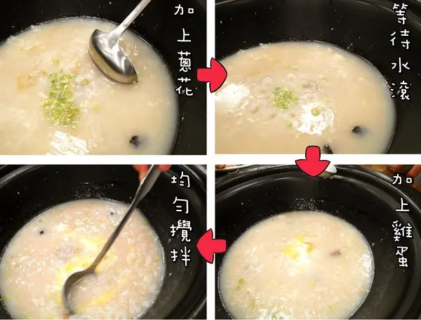 將這鍋精華海鮮粥加上些許蔥花及芹菜,等待水滾之後,打入雞蛋,攪拌均勻就完成囉
