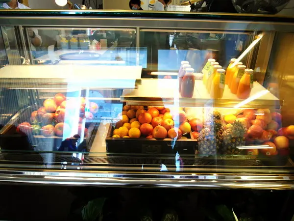 櫥窗櫃上陳列了新鮮水果及玻璃瓶裝的現榨果汁,提供給不喝咖啡的朋友最選擇