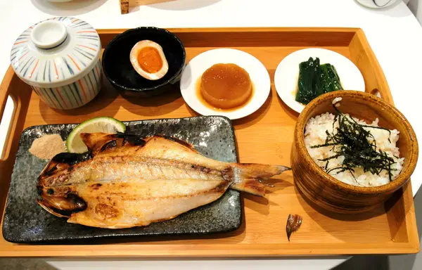 一夜干定食 299元 一夜干定食套餐裡包含了一夜干、味噌湯、三樣小菜及白飯,小菜的部分會不定期做更換