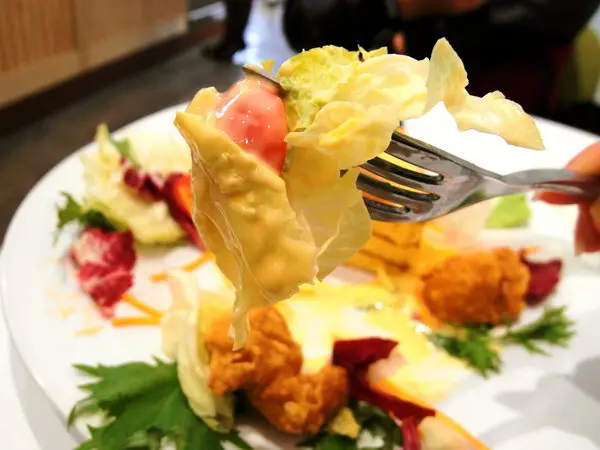一旁的沙拉也沒再淋上任何醬汁,直接沾著上頭得起司醬食用生菜配上熱熱的起司醬,別有一番風味,不過少了清爽口感,吃多了會有些膩口