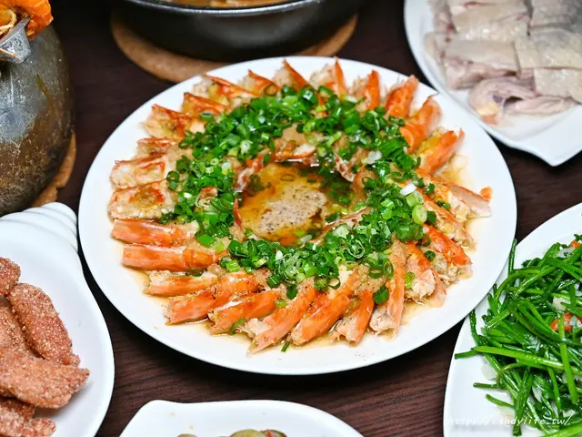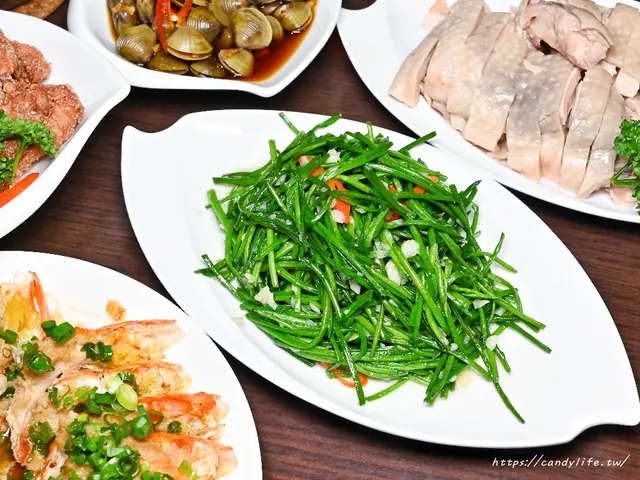 整桌有蝦、有肉非常豐盛,但對於女生來說沒有青菜可是非常扣分的唷,一品活蝦青菜有高麗菜、水蓮、空心菜跟大豆苗,糖糖今天點的是水蓮,水蓮菜算是家喻戶曉但比起空心菜或是地瓜葉又來的少見一點,水蓮口感清脆搭配蒜頭辣椒大火快炒一下即可上桌,好吃