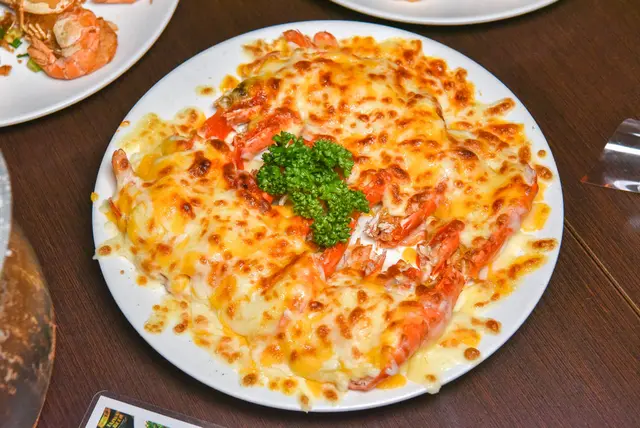 起司控一定要點這道!芝士焗蝦是將泰國蝦切片排開後,再鋪上滿滿的雙色起司焗烤完成,這道看起來超邪惡!