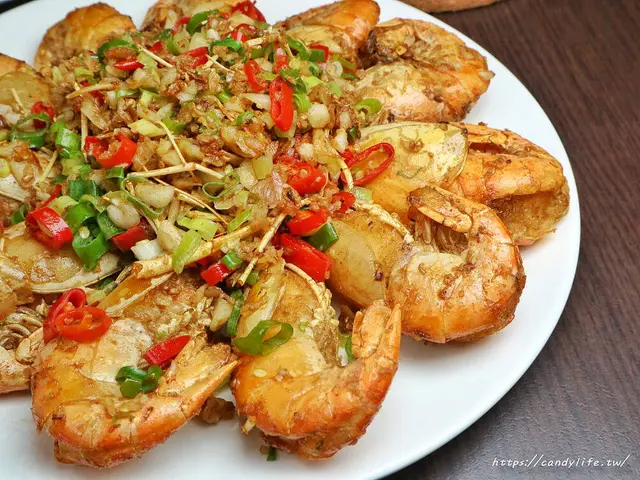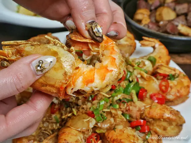 第一道料理糖糖選的是鹹酥蝦,另外加了200元升級成大份量,將泰國蝦先炸後炒,雖然蝦子炸過,不過肉質依舊飽滿不縮水,加入大量辛香料爆炒蒜頭、青蔥、秘制胡椒鹽過後更顯香氣四溢