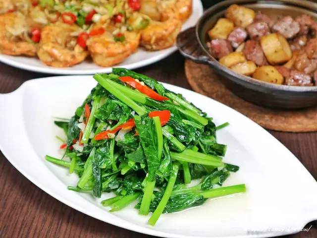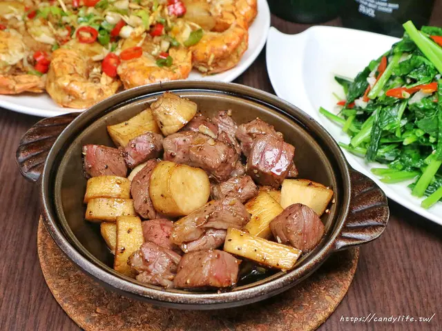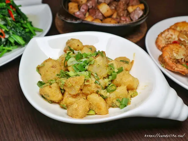 特色料理糖糖選了這道金莎鮮竹筍也是一般比較少見的料理,金莎料理很常見,但配上竹筍就比較特別了吧,採用新鮮竹筍,切成塊狀後炸至金黃香脆,接著再表皮裹上香濃的鹹蛋金沙,口感超清脆,吃的到竹筍的鮮甜交織著鹹蛋黃的鹹香,讓人越吃越涮嘴