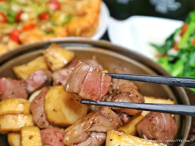 接下來這道特級美國骰子牛也是讓糖糖大大驚豔的料理之一,雖然一品活蝦是主打活蝦料理,不過的餐點也不遜色,尤其是這道特級美國骰子牛,精選美國Prime特選級牛排,切成好入口的大小,加入杏鮑菇及黑胡椒下去香煎入味,色香味俱全