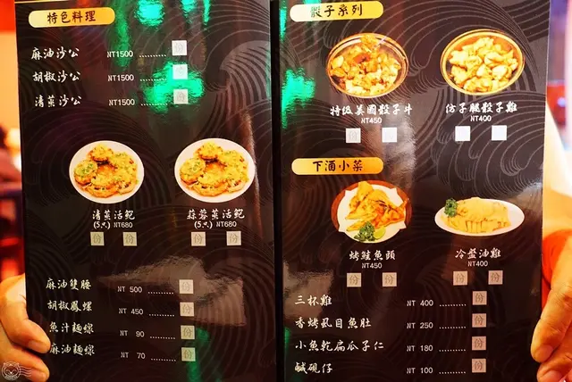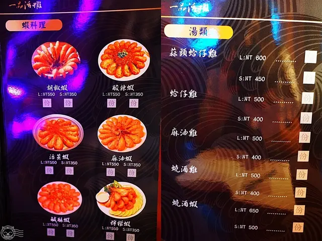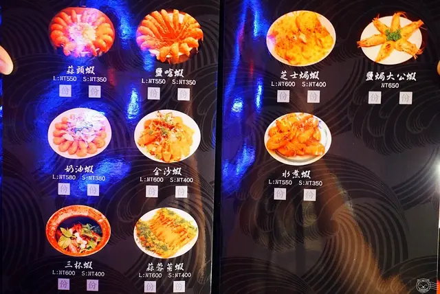 餐點以活蝦和海鮮為主力,光活蝦料理就有15種,還有沙公、活鮑、鳳螺等海味,跟骰子牛/雞、特色料理、XO醬料理跟湯品、飲料。