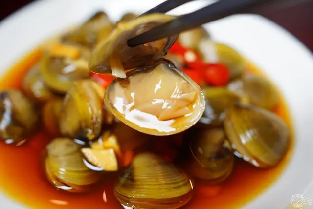 店家自己醃的鹹蜆仔,用熱水泡開的蜆仔肉很飽滿,沒有縮小小,吸收了鹹甘辣的醬油、蒜頭和辣椒湯汁。