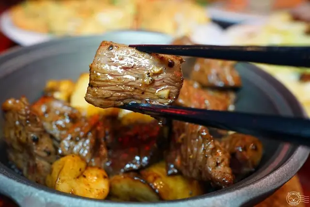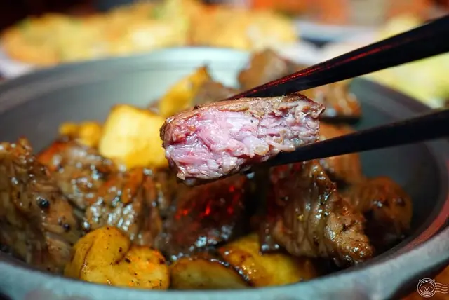 用鐵鍋盛裝的骰子牛一上桌就滿室飄香,油油亮亮的外觀讓人想多舀一碗飯,還好白飯免費無限吃到飽,不然誰受的了呀!