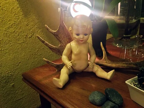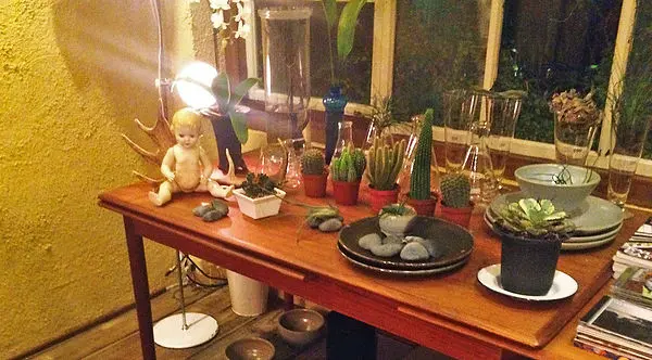 捷克來的骨董娃娃既安詳(?)又驚悚的坐在仙人掌旁。