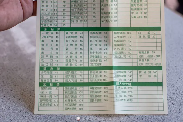 上寶茶行菜單就跟以前我們常去的泡沫紅茶店一樣,就是飲料、小點跟簡餐,簡餐一定會有小火鍋,飲料除了紅茶之外,很多人也都會珍珠奶茶,但更厲害的都會點特調啦!蛋蜜汁跟芬蘭汁都是以前很紅的調飲飲品,店內以規定低銷一個人是50元。