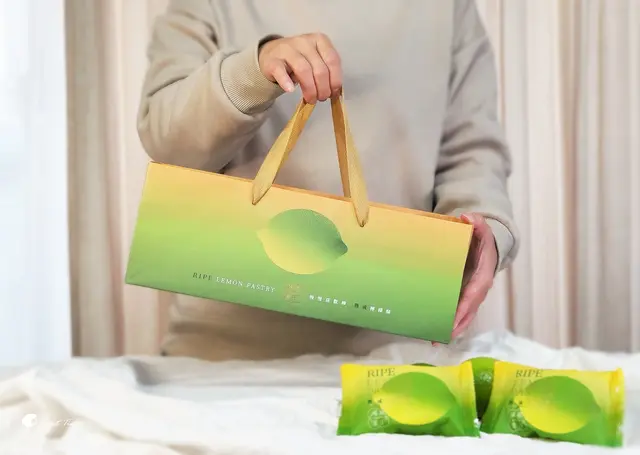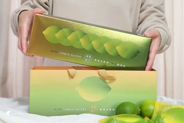 熟成檸檬酥的提袋和禮盒融入了檸檬的圖樣及色系,整體亮眼不花俏,提在手上質感加分。