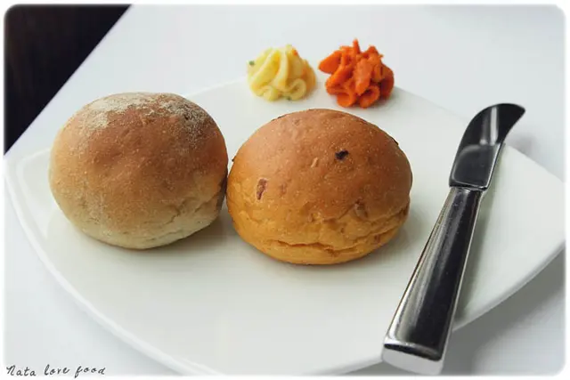 麵包盤上佐附的奶油,淡黃色是蒜味、橘紅色的是蕃茄奶油,味道表現以蕃茄較為突出,蒜味則不太明顯。