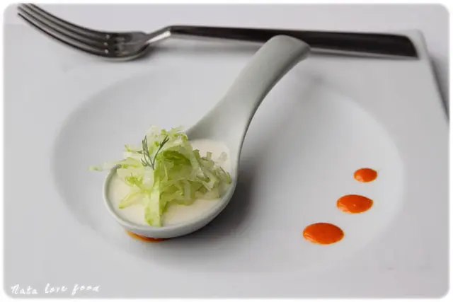 不過吃了以後倒是蠻驚豔的,沒想到鮭魚味濃郁卻細緻得完全嚐不到魚肉口感的這款奶凍,滋味是那麼滑順豐潤!搭配爽口生菜絲和少許微辣的海膽醬一起品嚐,又是另一番饒具層次感的風味。