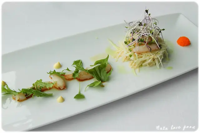 青木瓜絲處理得很像牛蒡一般爽脆,搭配新鮮蟹肉和蛋黃醬一起品嚐,爽口滋味倒也挺開胃。