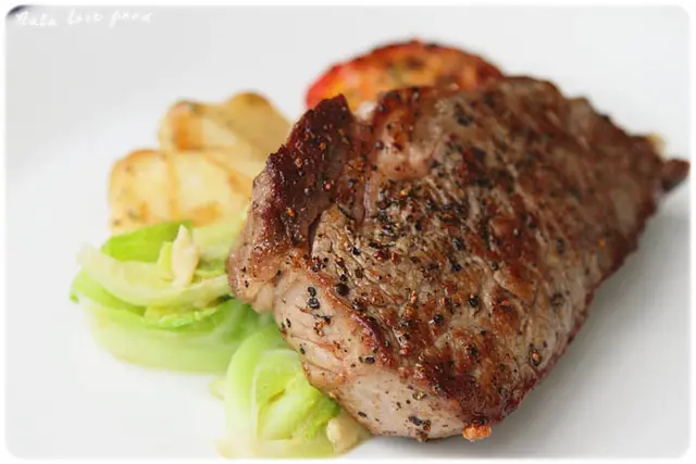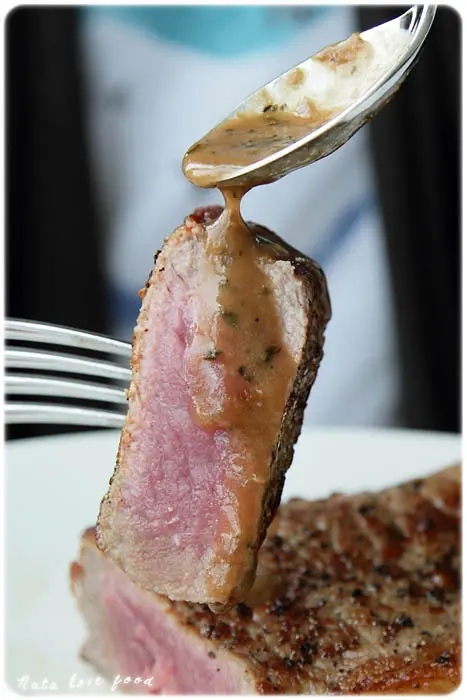 不想簡單灑點鹽、胡椒吃原味的話,也可以淋牛汁熬煮而成的黛安醬汁換換口味。